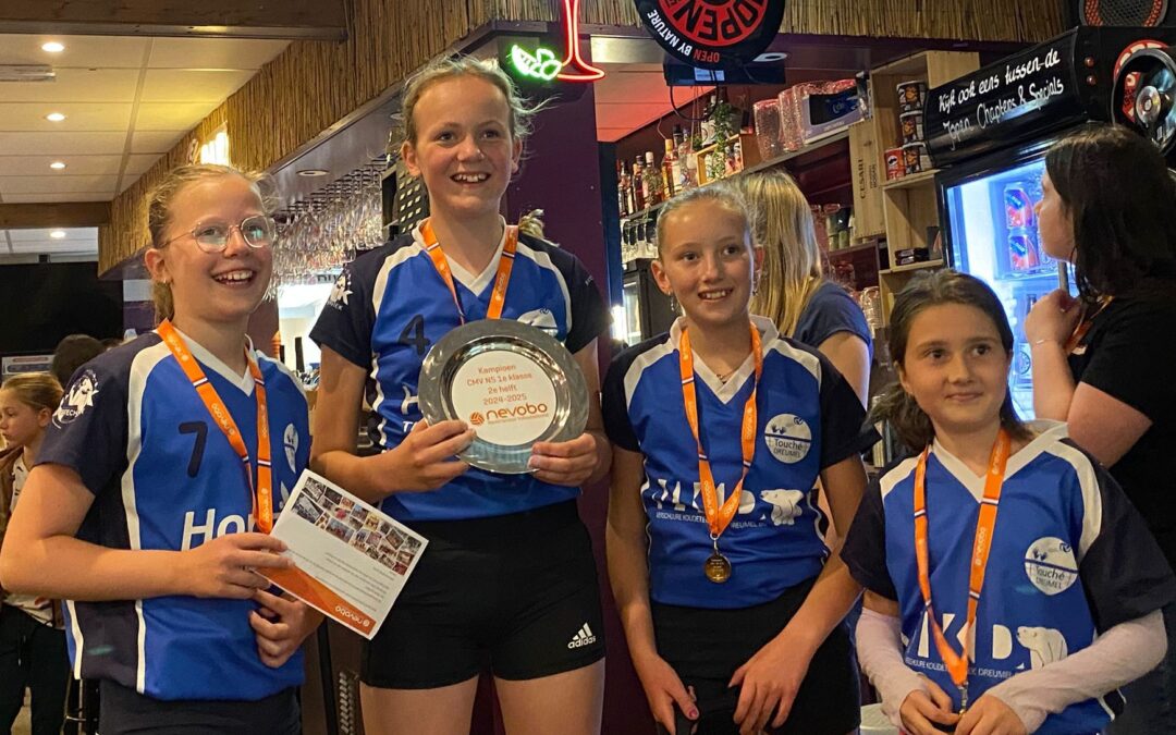 Jet, Meike, Britt en Daria moesten 3 wedstrijden. De 2de wedstrijd moesten ze tegen de nummer 2. Die moesten ze winnen om kampioen te worden. Deze wedstrijd werd dik gewonnen. De andere 2 wedstrijden speelden de meiden gelijk. Met een mooie medaille en een schaaltje gingen ze terug naar Dreumel.
